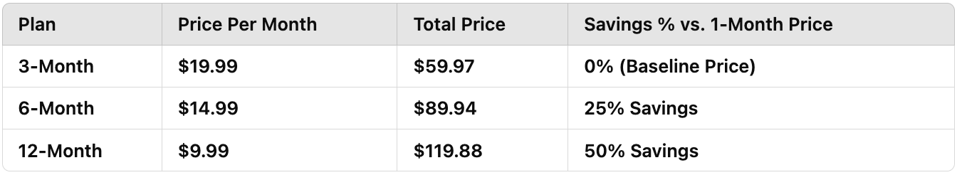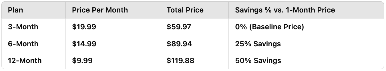 🔹 Set a strong anchor price → The shortest plan should have the highest per-month cost to make longer-term plans more attractive.