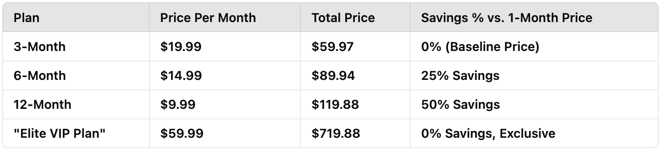 ➡️ The VIP Plan acts as the extreme anchor. It is so outrageously high, most customers will instantly disregard it—but in doing so, they will naturally gravitate toward the 12-month plan, which now seems incredibly affordable and the best value.